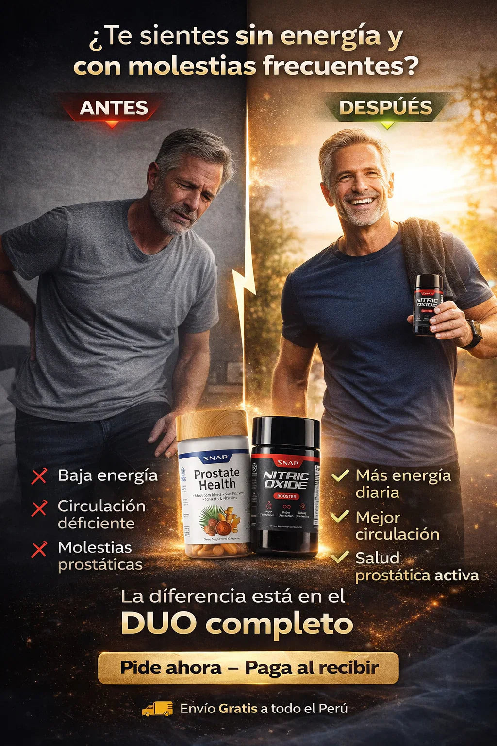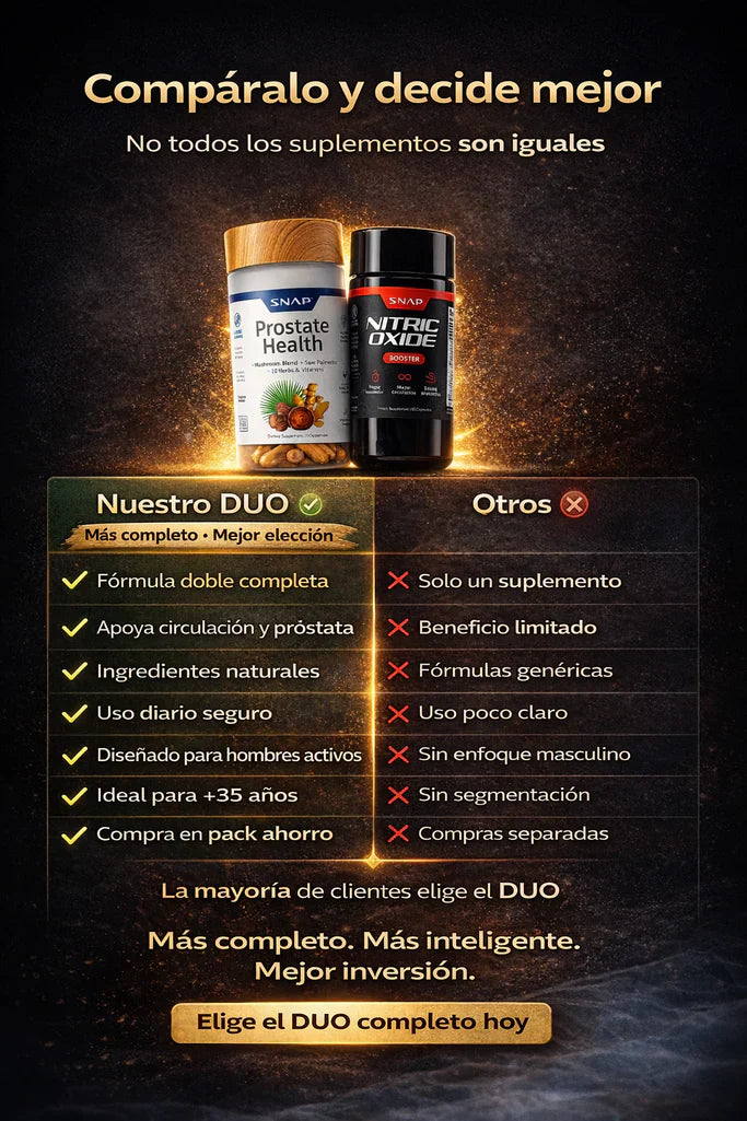 Doble Acción Científica: Con Óxido Nítrico para maximizar el flujo sanguíneo y extractos naturales que apoyan integralmente la función prostática. La combinación perfecta para recuperar tu potencia y energía día tras día.😔